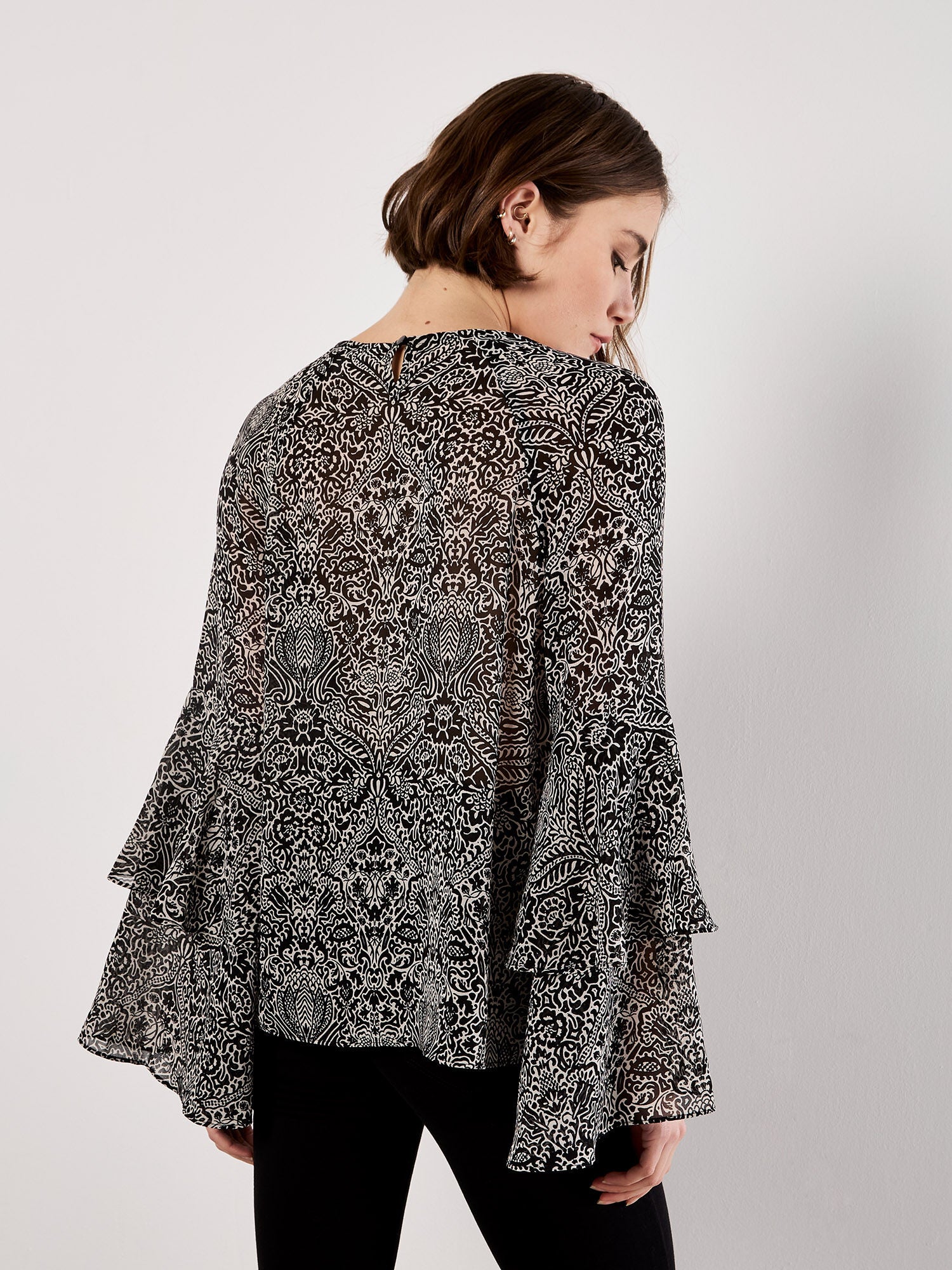 Légère et tissée, elle présente une coupe décontractée et près du corps, un col rond et de larges manches à volants.