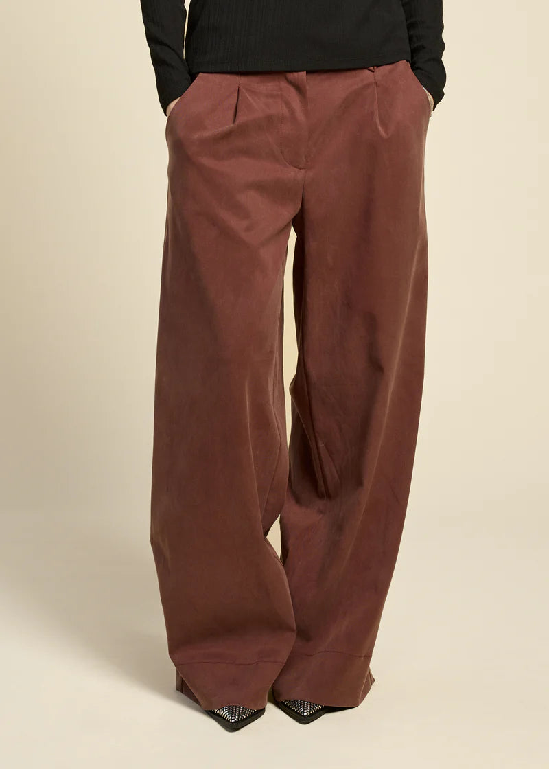 Pantalon à la taille légèrement basse, fermé par une braguette. C'est un pantalon à jambes très larges avec des passants en forme de pointes et des plis au devant.
